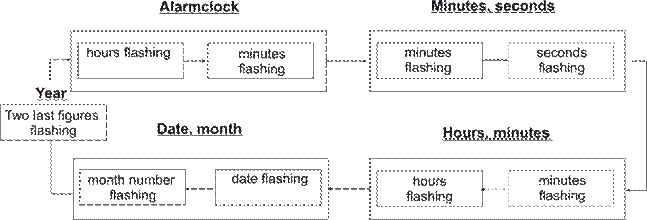 Attention! The long stay in the PC communication mode (PCon) decreases the battery service life. 3.2.7 The reference mode allows displaying on the LCD: - the time in hours and minutes when the alarm clock will be turned ON (the alarm clock mode); - the date, the month and the year; - the current time (in minutes and seconds); - the preset DER thresholds ( Sv/h); - the preset DE thresholds (mSv), (see clause 3.2.6.1); - the DE accumulation time (in hours) and allow switching ON/OFF the alarm clock as well. To switch over from the current time indication mode to the reference mode it is necessary to switch on the current time mode as described in clause 3.2.2. Then after short pressing of button 2 (SELECT) the following information is indicated on the LCD in rotation (Fig. 3.5): - the time (in hours and minutes) when the alarm clock will be turned ON; - the date, the month and the year; - the current time (in minutes and seconds). - ![]() Fig.3 5 The indicator will automatically return from the reference mode to the current time indication mode in approximately 5 seconds. N o t e - To exit from the current time reference in minutes and seconds it is necessary to press button 2 (SELECT) again. 19