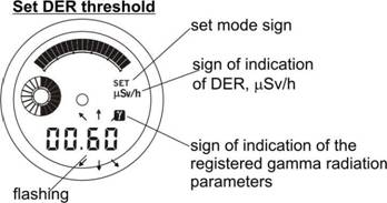 mode the corresponding sign " The alarm clock signal will sound at the preset time and will be activated for 60 seconds. Stop the sound signal by short pressing of button 2 (SELECT), button 1 (MODE) or button 3 (LIGHT). ![]() Fig. 3.6 To switch over from the DER indication to the reference mode it is necessary to switch on the DER indication as described in clause 3.2.2. Then after the short pressing of button 2 (SELECT) the preset threshold of DER (in Sv/h) and the filled in linear analogue scale will be displayed on the LCD (Fig.3.7). In approximately 5 seconds the indicator will automatically return to the DER indication. ![]() Fig. 3.7 To switch over from the DE indication to the reference mode it is necessary to switch on the DER indication as described in clause 3.2.2. Then after the short pressing of button 2 (SELECT) the preset threshold of DE (in mSv), the filled in circular analogue scale and DE time accumulation (in hours) will be displayed in rotation on the LCD (Fig.3.4). In approximately 5 seconds the indicator will automatically return to the DE indication. Knowledge of the DE accumulation time is of great importance from the point of view of medical and biological consequences for a human organism! (See “Standards of radiation safety”) 20 3.2.8 Set mode 3.2.8.1 In the set mode the user has the following possibilities: - to set the alarm clock ON time and current time; - to set DER threshold; - to set DE thresholds. 3.2.8.2 To set the alarm clock ON time and current time enter the time indication as described in clause 3.2.2. Then the long pressing of button 2 (SELECT) switches on the setting the alarm clock ON time. After this the display will show the flashing hours of the alarm clock setting and the set mode sign - SET (Fig. 3.8). ![]() Fig. 3.8 To correct the flashing digit by one press and release button 1(MODE). For setting the minutes, press and release button 2 (SELECT) again. The minutes will be flashing. Pressing of button 1 (MODE) will change the flashing digit by one. So, each short pressing of button 2 (SELECT) will switch the values in rotation shown on Fig.3.9: - hours of setting the alarm clock ON time; - minutes of setting the alarm clock ON time; - seconds of the current time; - minutes of the current time; - hours of the current time; - date; - month's nomber; - year. 21 ![]() Fig.3.9 Each short pressing of button 1 (MODE) changes the flashing digit by one. Hold down this button to change the digits rapidly. N o t e - Pressing of button 1 (MODE) when seconds of the current time are flashing will result in their resetting. This allows the electronic watch setting according to time-signals. The indicator will automatically exit from the set mode, if the buttons are not used for approximately 1 minute, or by long pressing of button 2 (SELECT). 3.2.8.3 To set DER threshold switch on DER indication mode according to clause 3.2.2. The long pressing of button 2 (SELECT) switches on the indication of the preset DER threshold on LCD; the two least significant digits (tenths and hundredths of µSv/h) will be flashing, the set mode sign SET will appear and the filled in linear analogue scale will be indicated (Fig. 3.10). ![]() Fig 3.10 Each shot pressing of button 1 (MODE) changes the value by one. The next short pressing of button 2 (SELECT) will make the first two digits before the decimal point flashing on the display (units and tens of µSv/h). Change these digits by pressing button 1 (MODE). The next short pressing of button 2 (SELECT) makes the first two digits flashing on the display (hundreds and thousands of µSv/h), which may be also changed by pressing button 1 (MODE). 22